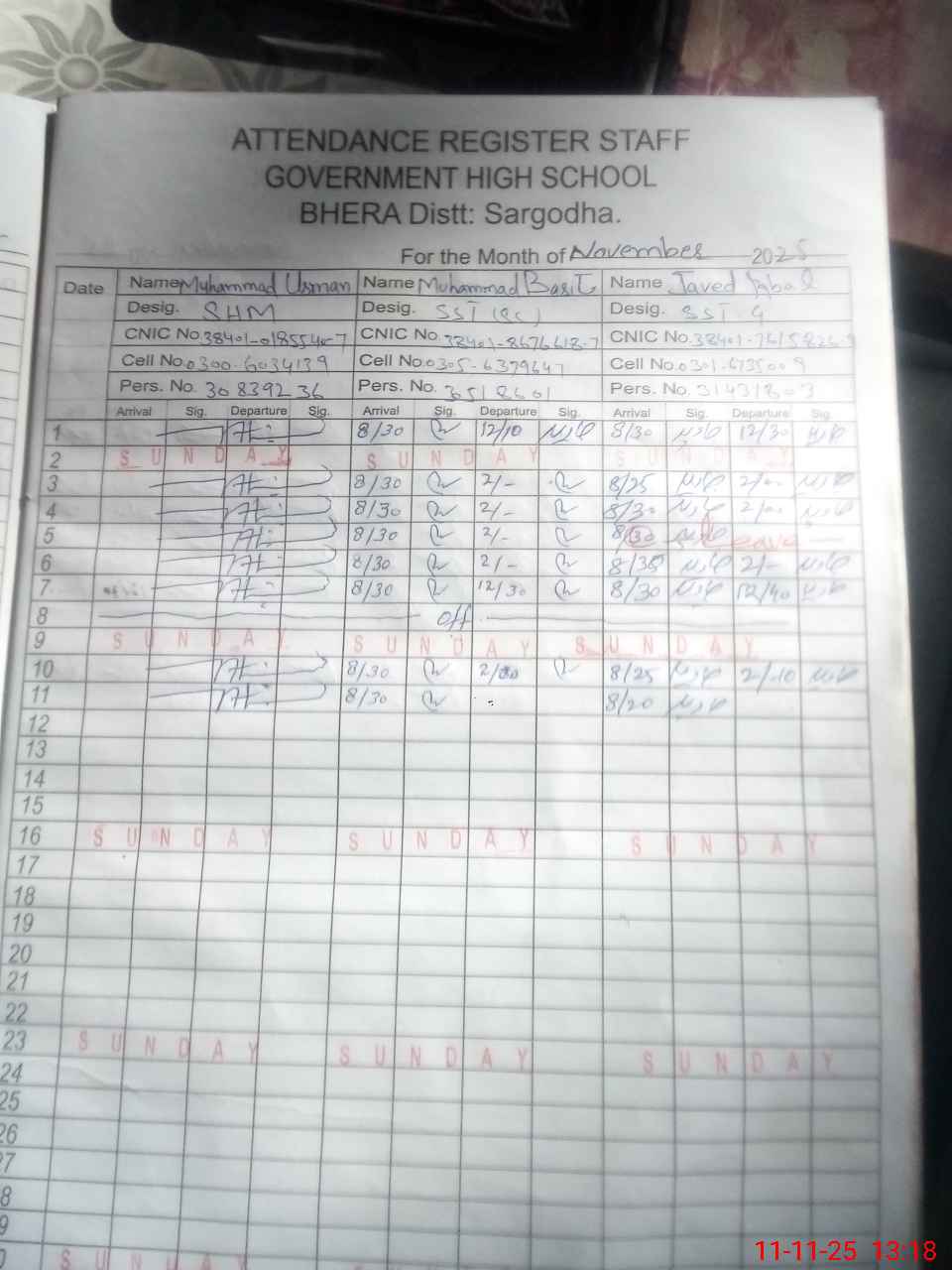 | CNIC | Full Name | Designation | R/C | Absence during last cal. month |