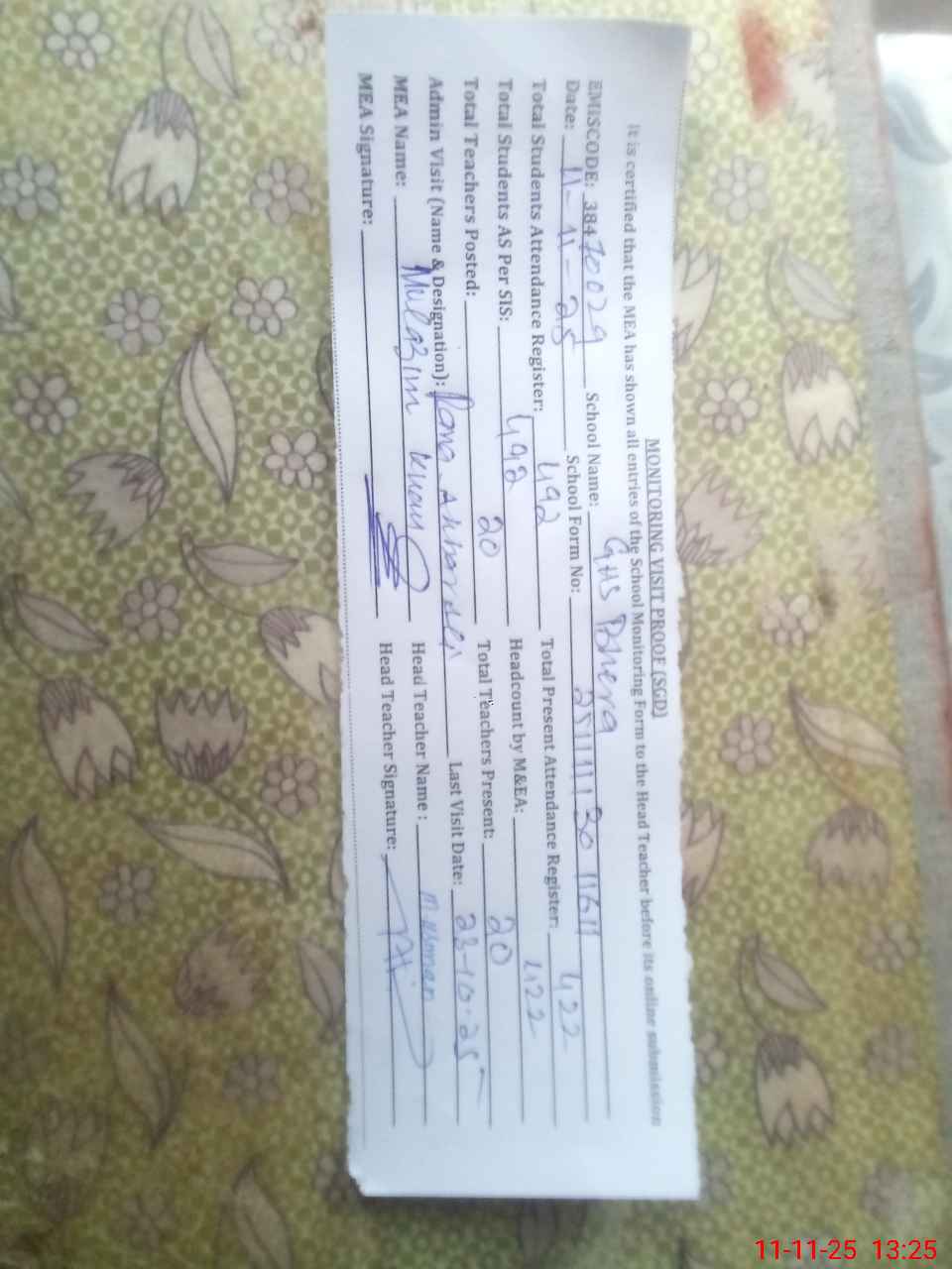 | Attendance Register | Head Teacher | MEA with School | Visit Proof |