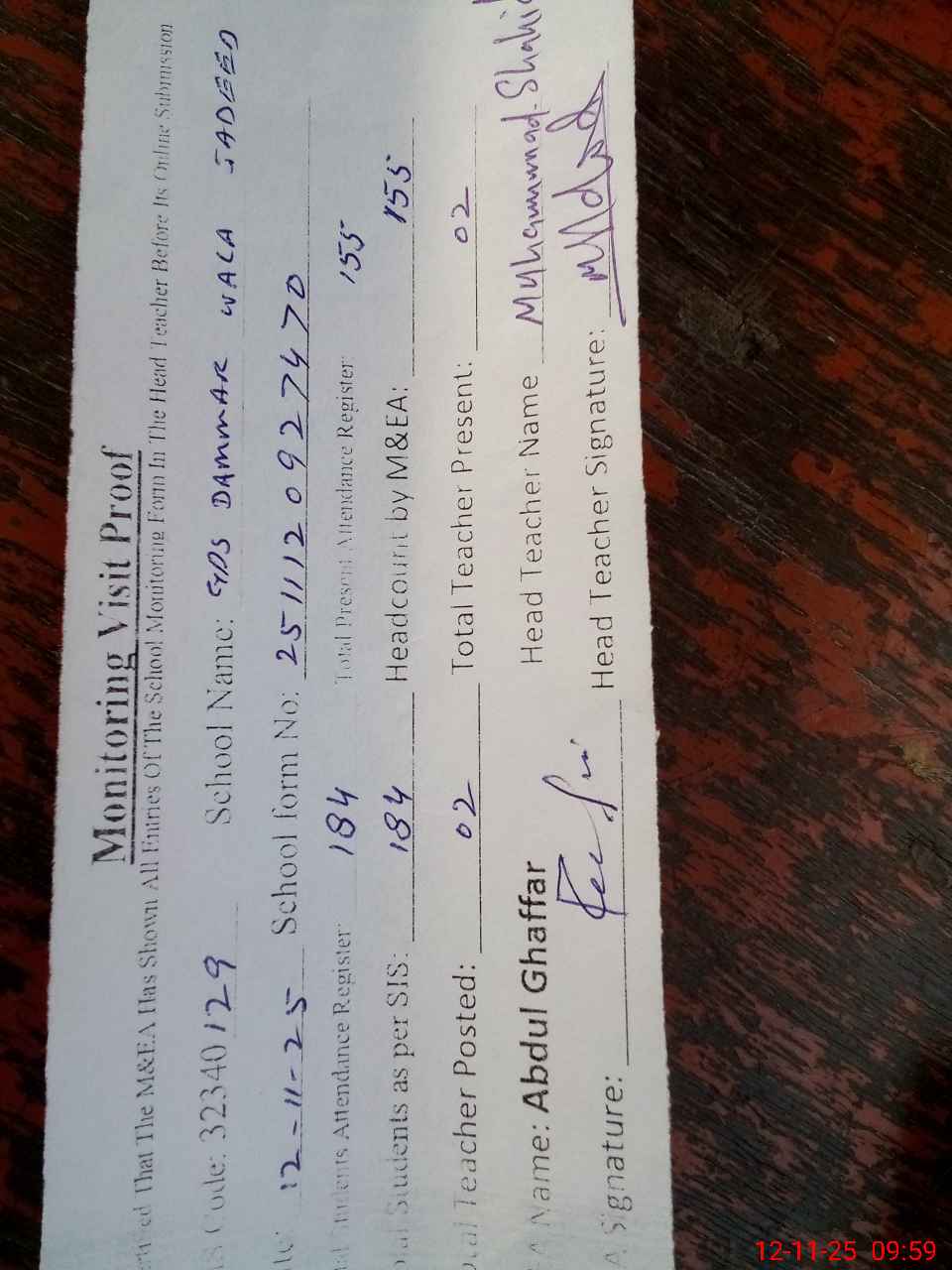 | Attendance Register | Head Teacher | MEA with School | Visit Proof |