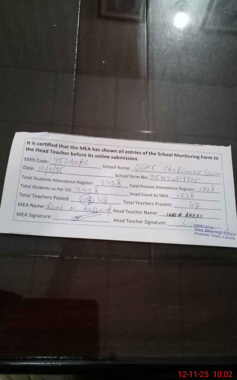 | EMIS Code: 35210080 | Name of School: GGHS SHALIMAR TOWN LAHORE | |||