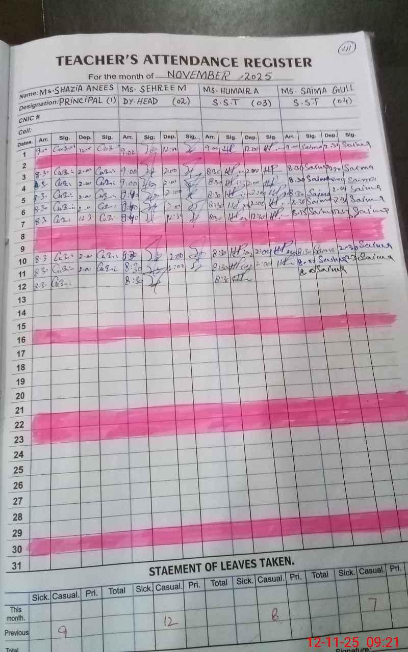 | Remarks (Use Separate Page if Required): Today in school celebrate Iqbal day Due to this reason school management declare off day for ECE class students to 4th class students for better arrangement | |||||