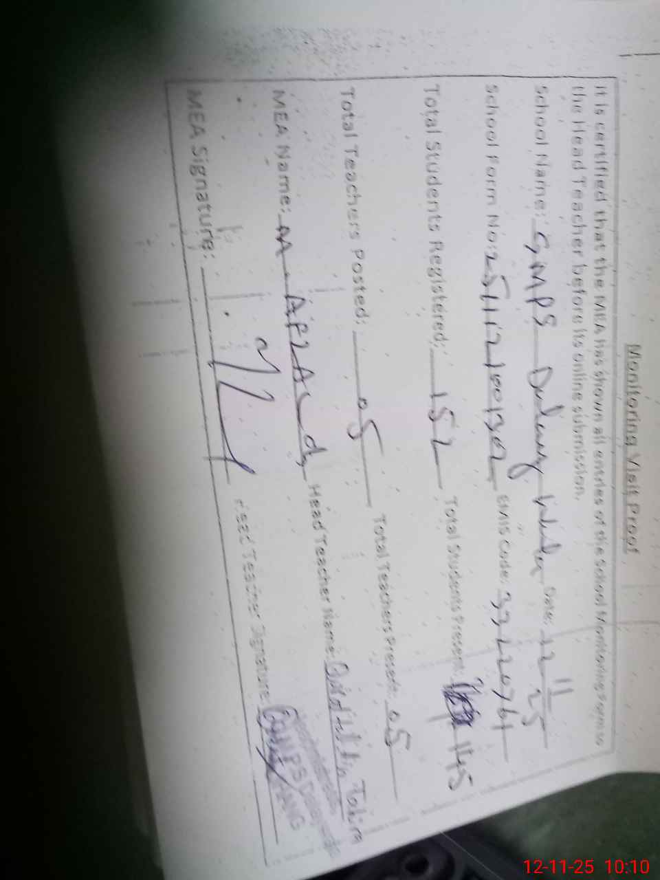 | Attendance Register | Head Teacher | MEA with School | Visit Proof |