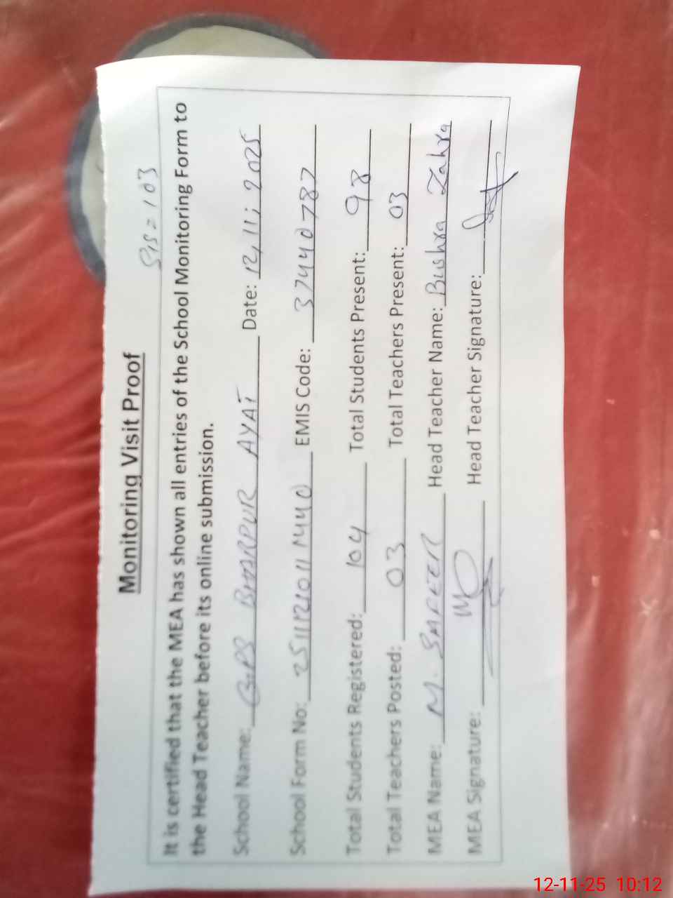 | Attendance Register | Head Teacher | MEA with School | Visit Proof |