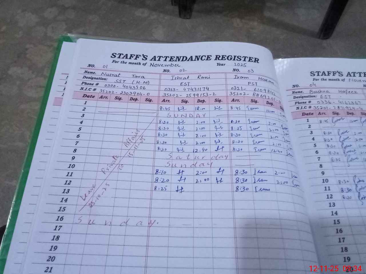 | CNIC | Full Name | Designation | R/C | Absence During Last Calender Month |