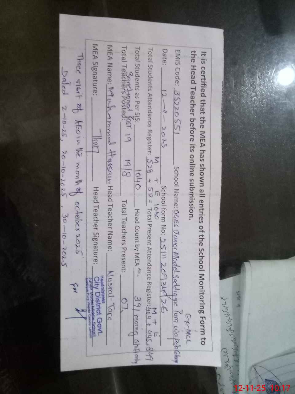 | Certified that this School was Inspected by the Undersigned MEA/DMO Today and the Information Stated Above is as Per Record. | |||||