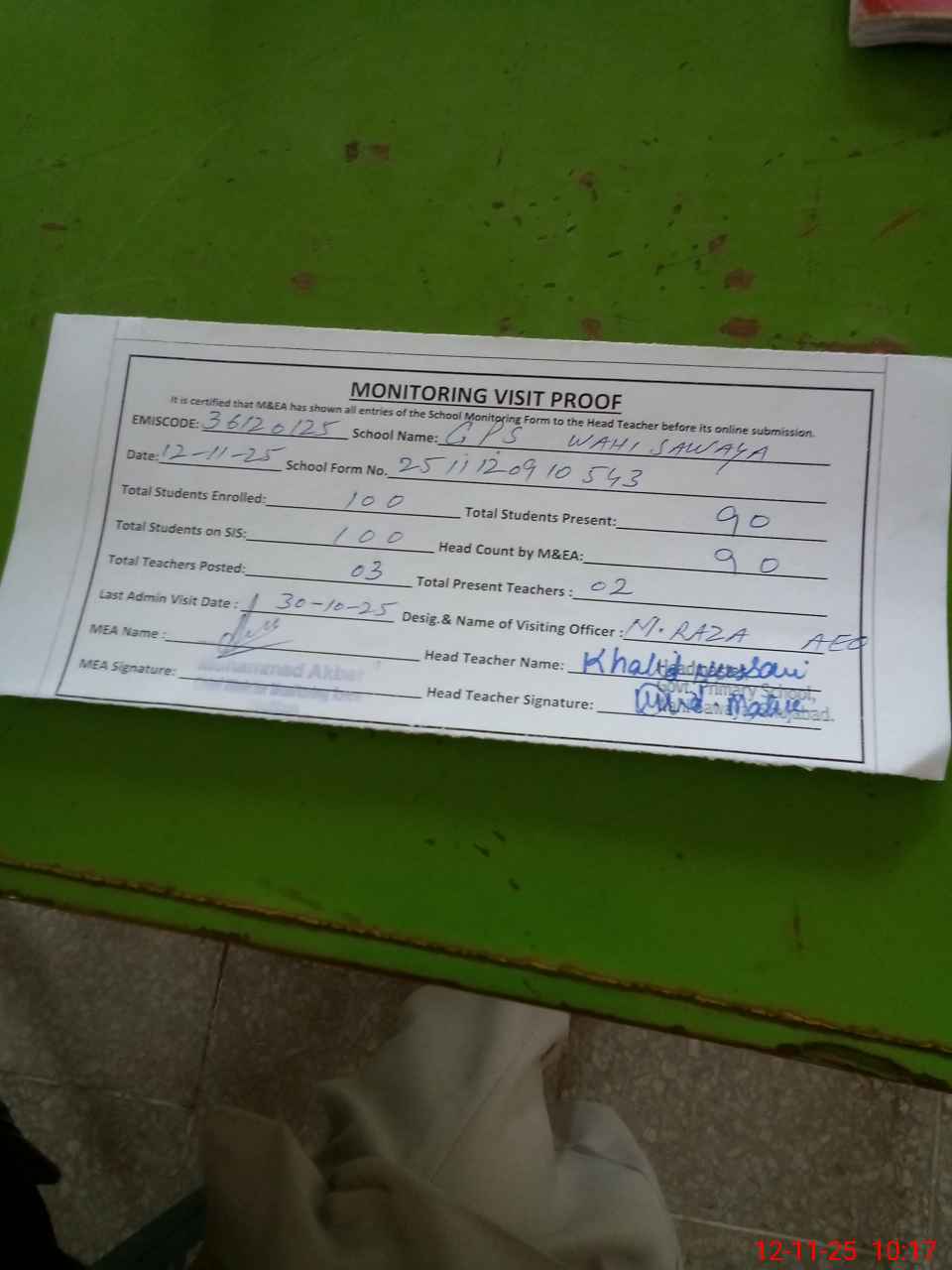 | Attendance Register | Head Teacher | MEA with School | Visit Proof |