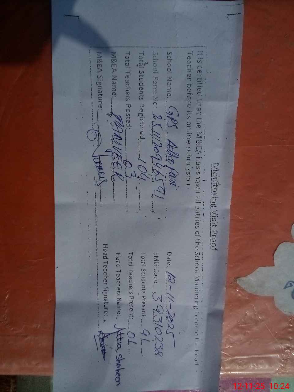 | Attendance Register | Head Teacher | MEA with School | Visit Proof |