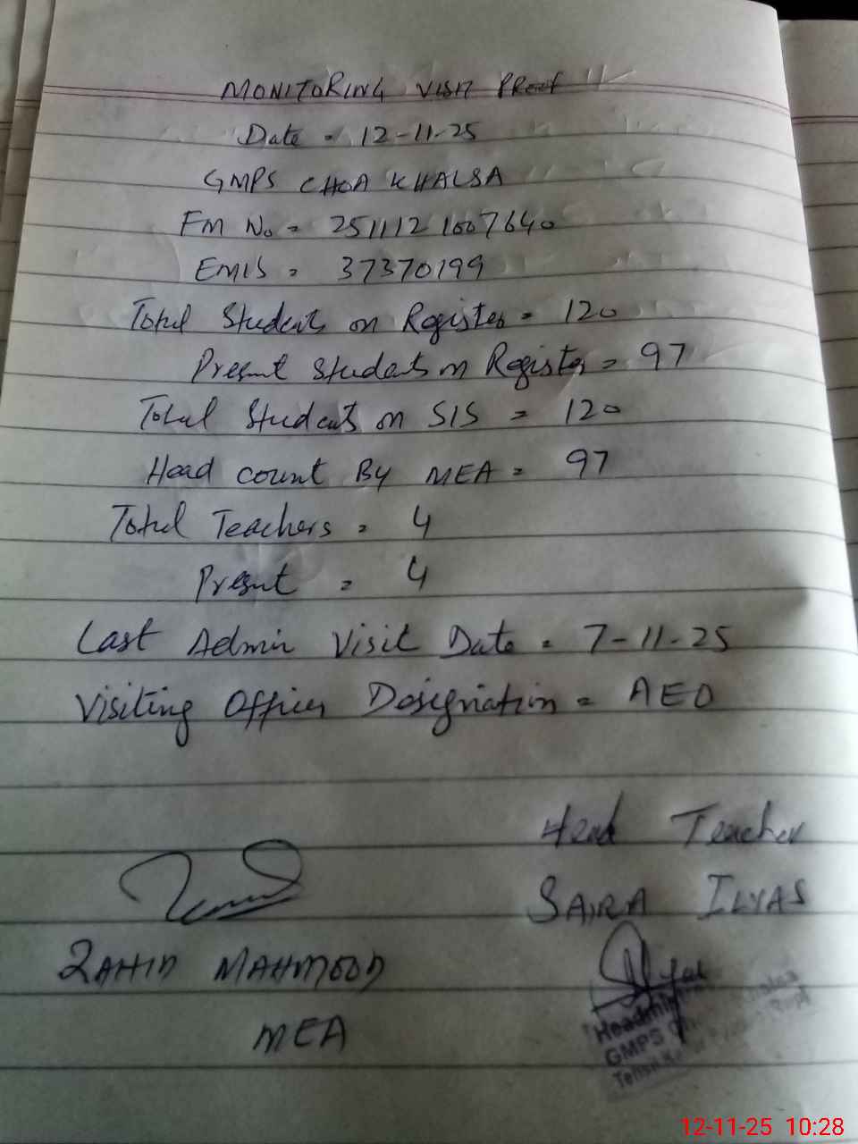 | Monitoring Date: 12-11-2025 | Start Time: 12-11-2025 09:56 AM | End Time: 12-11-2025 10:31 AM | Name of MEA: Za**** Me**** | |