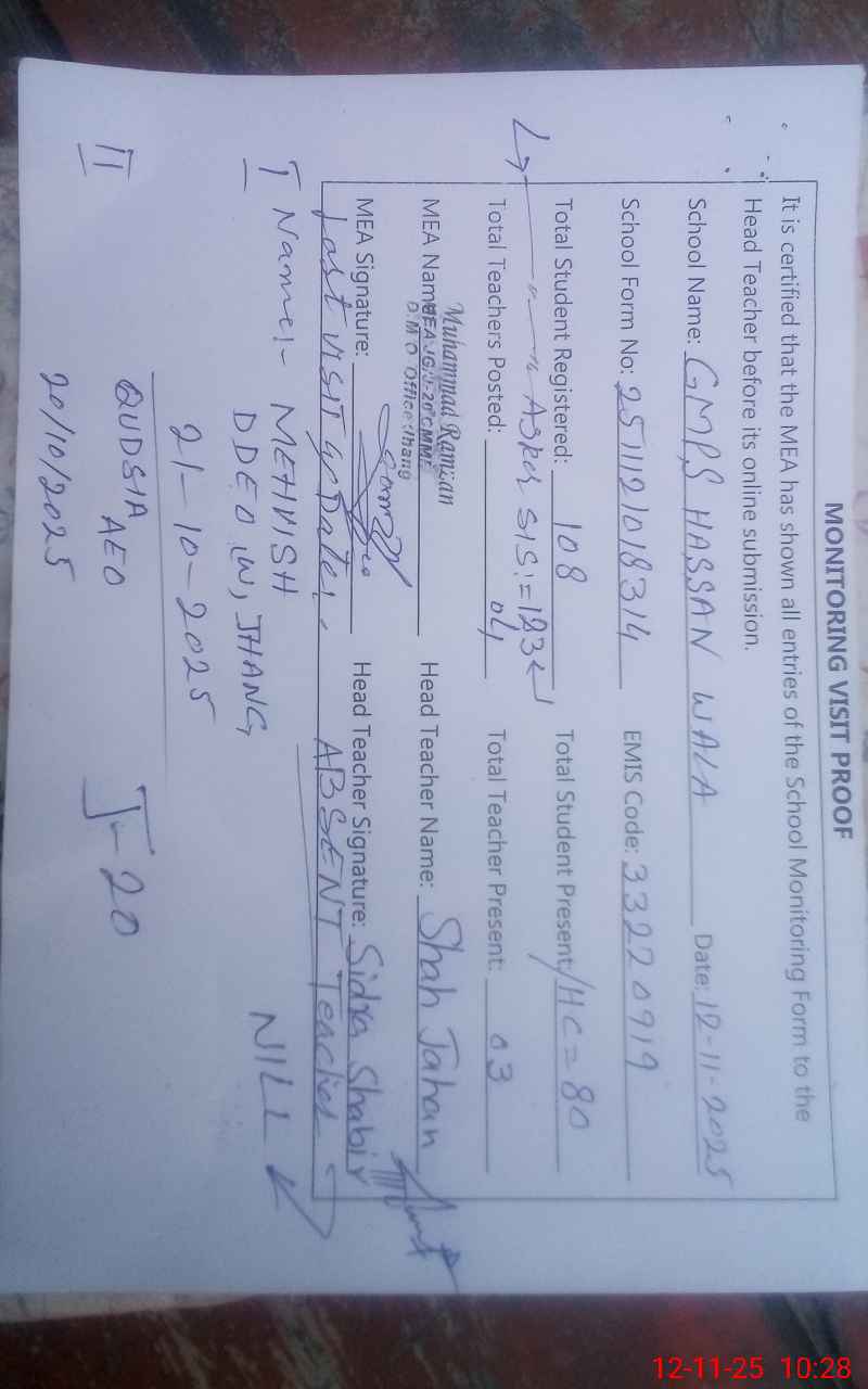 | EMIS Code: 33220919 | Name of School: GMPS HASAN WALA | |||