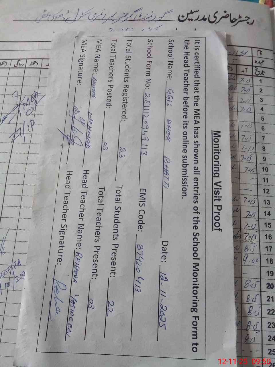 | Attendance Register | Head Teacher | MEA with School | Visit Proof |