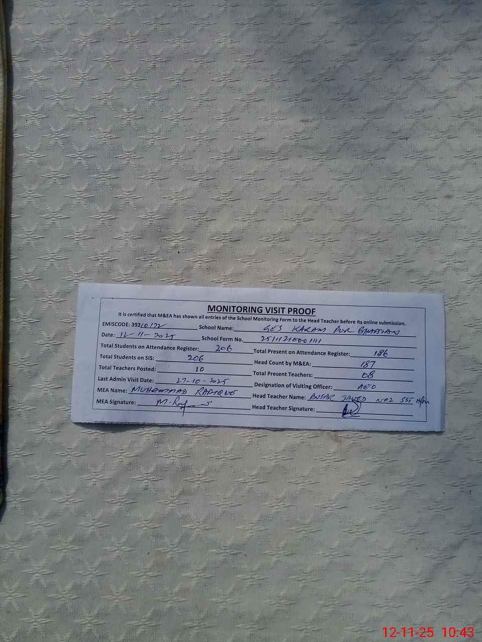 | Monitoring Date: 12-11-2025 | Start Time: 12-11-2025 10:00 AM | End Time: 12-11-2025 10:45 AM | Name of MEA: Mu**** Ra**** | |