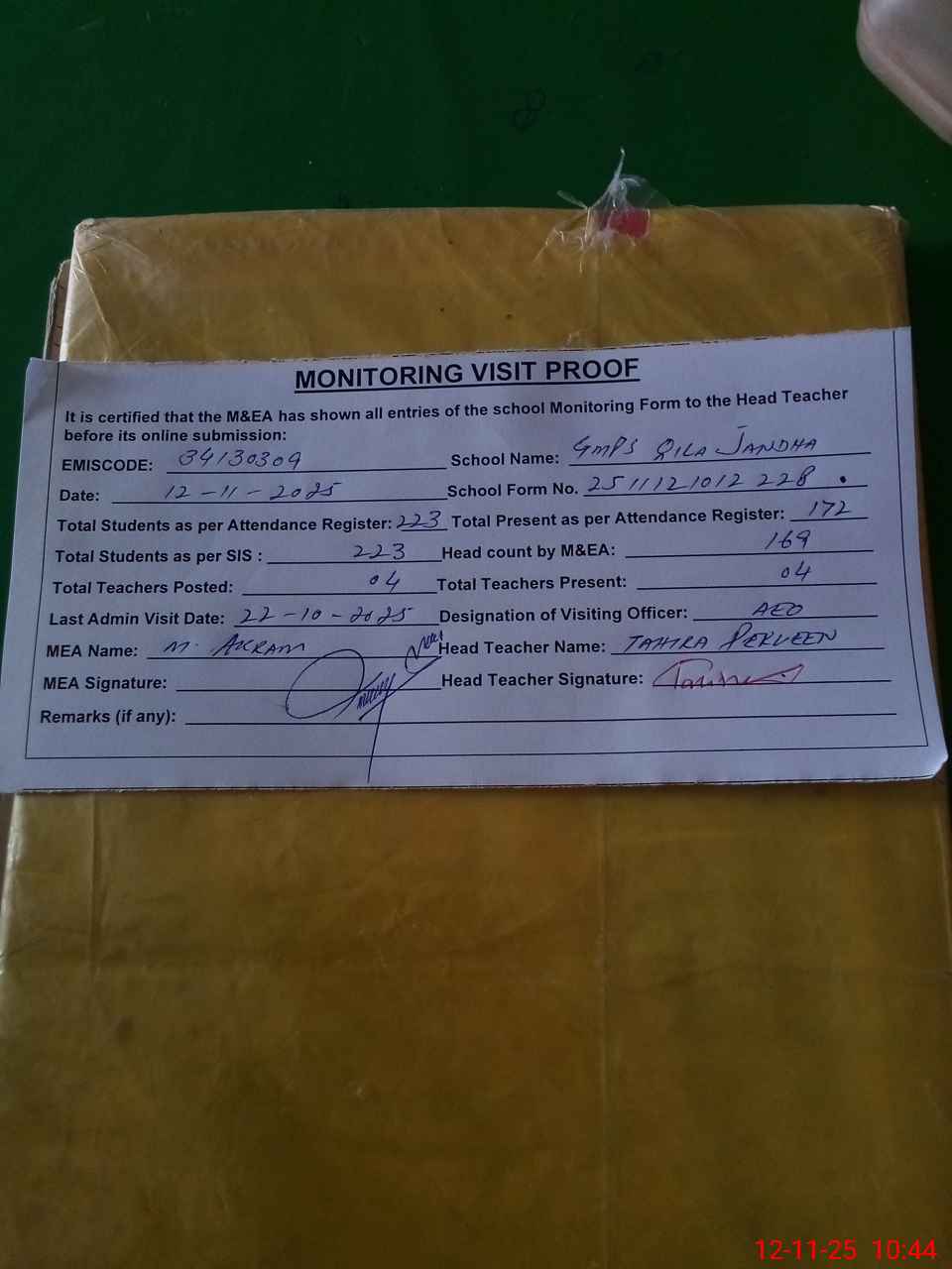 | Attendance Register | Head Teacher | MEA with School | Visit Proof |