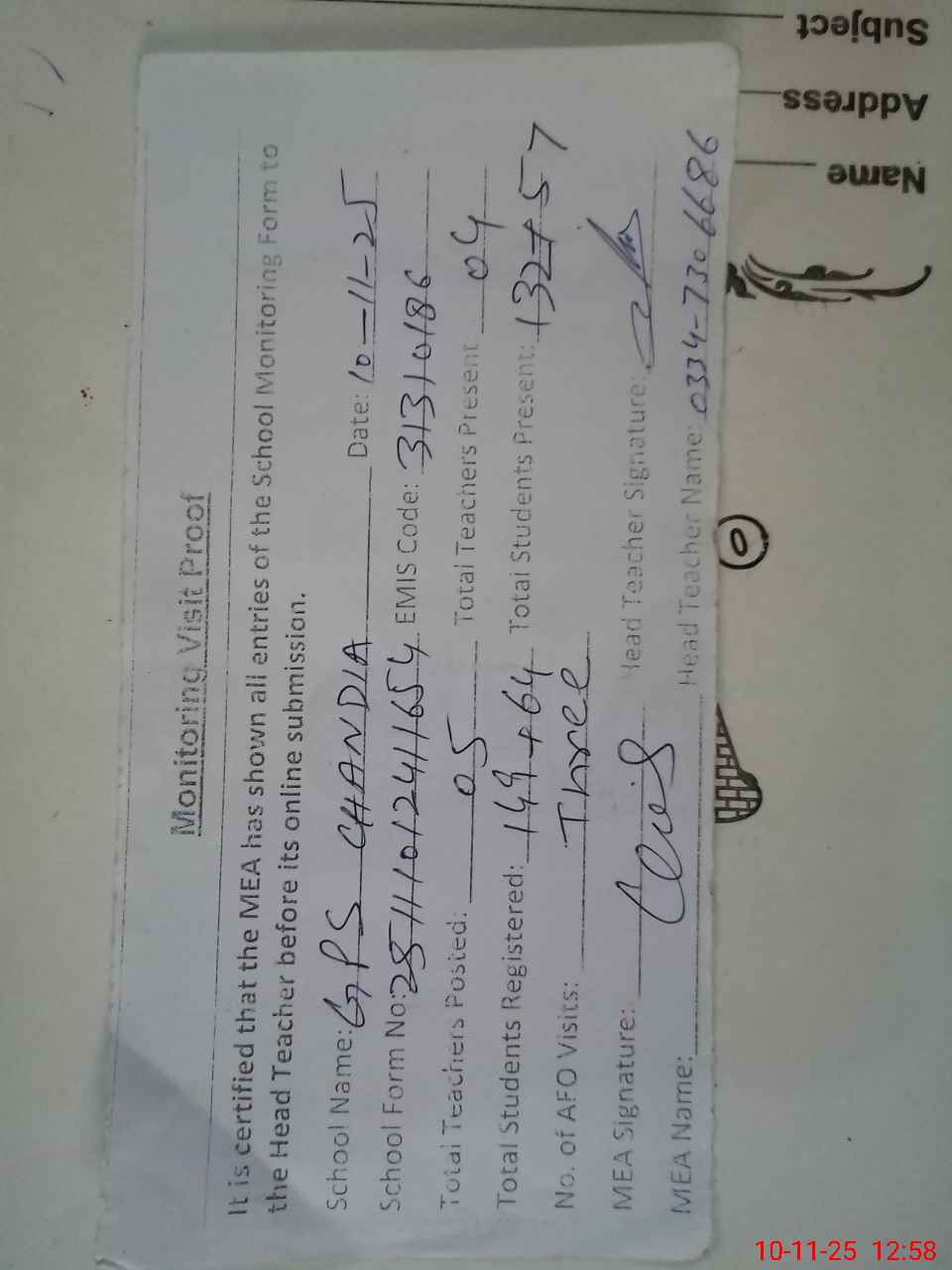 | Attendance Register | Head Teacher | MEA with School | Visit Proof |