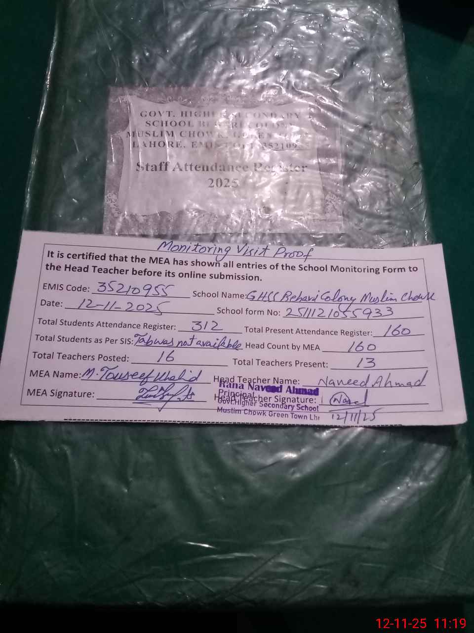 | Attendance Register | Head Teacher | MEA with School | Visit Proof |
