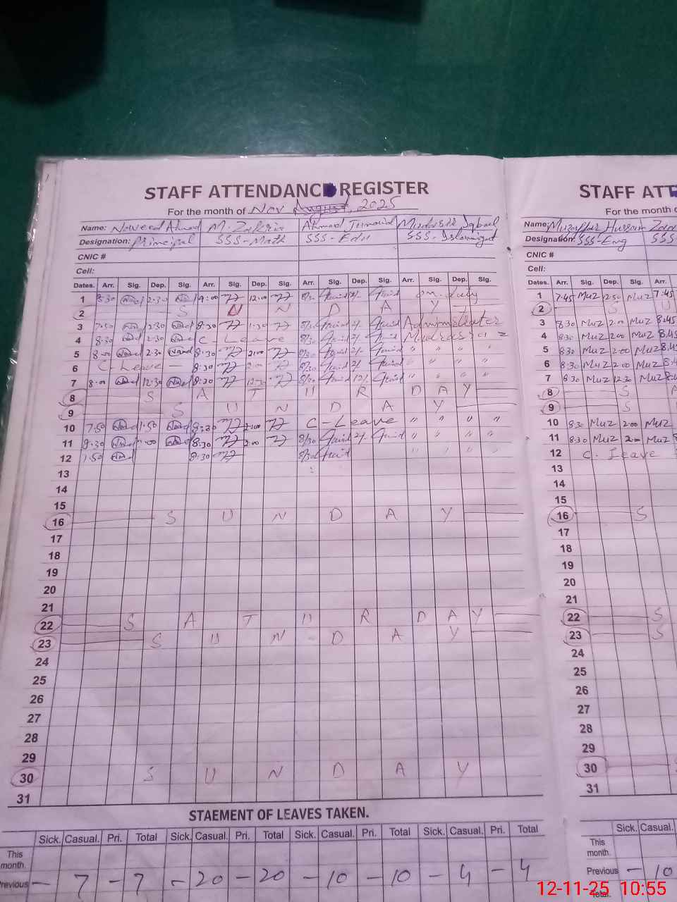 | CNIC | Full Name | Designation | R/C | Absence During Last Calender Month |