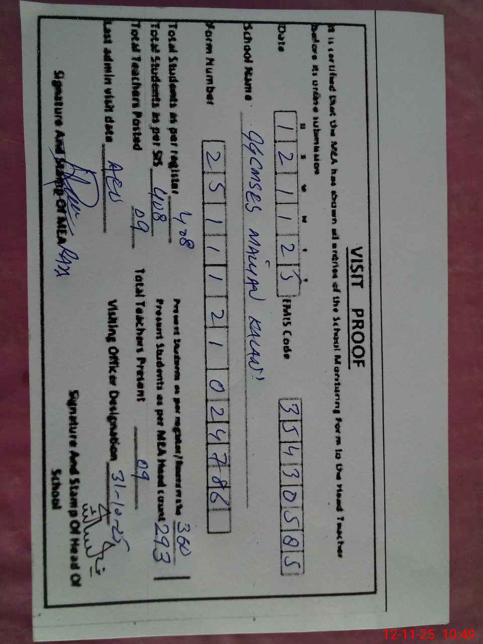 | Attendance Register | Head Teacher | MEA with School | Visit Proof |