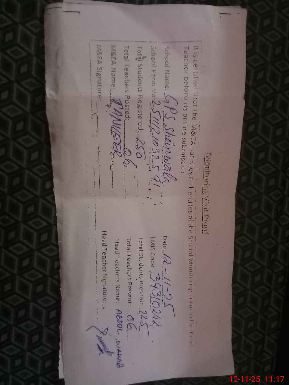 | Attendance Register | Head Teacher | MEA with School | Visit Proof |
