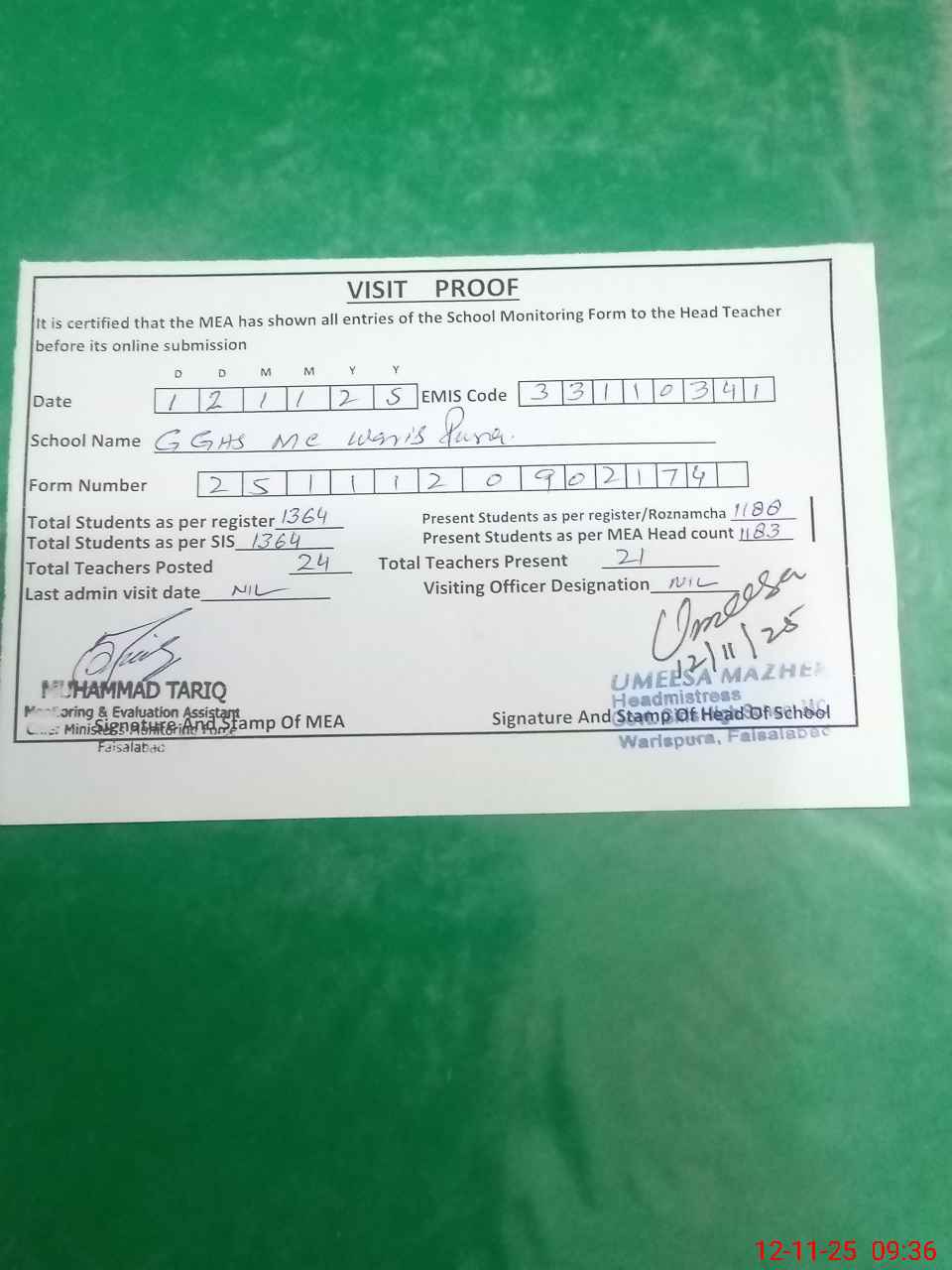 | EMIS Code: 33110341 | Name of School: GGHS MC WARIS PURA FAISALABAD | |||