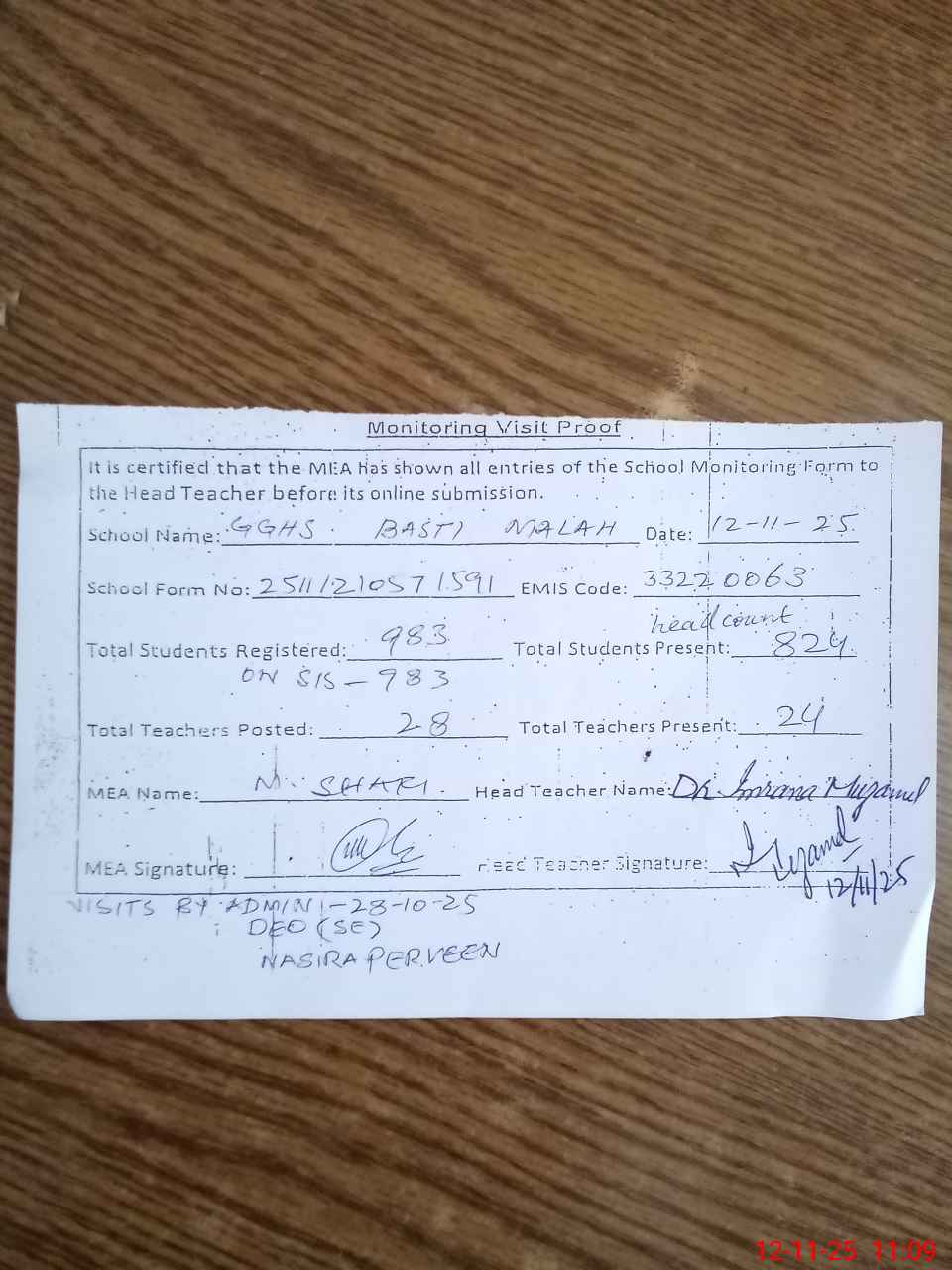 | Attendance Register | Head Teacher | MEA with School | Visit Proof |