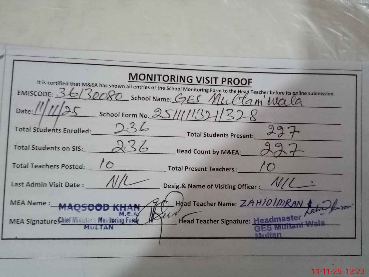 | Attendance Register | Head Teacher | MEA with School | Visit Proof |