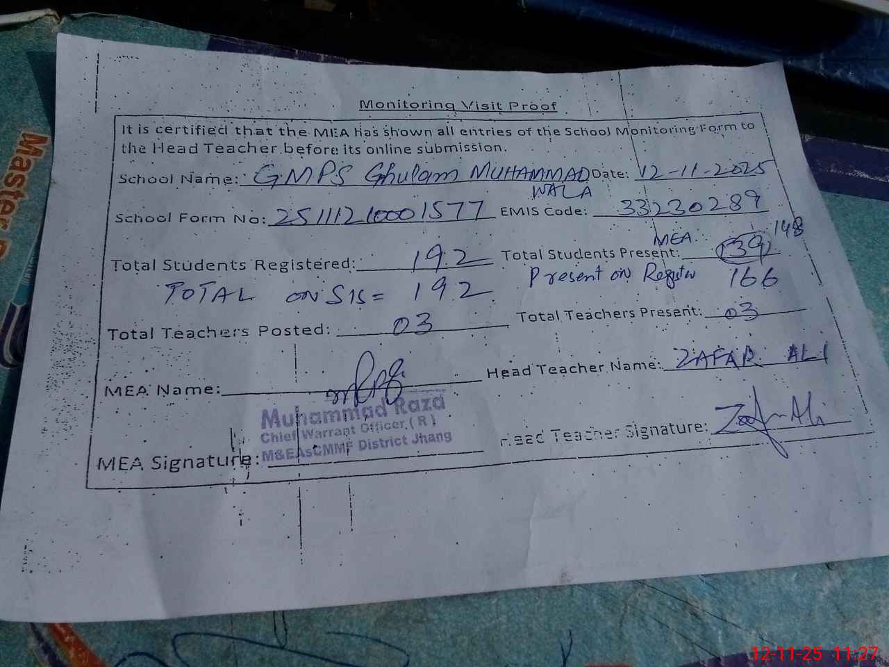 | EMIS Code: 33230289 | Name of School: GMPS GHULAM MUHAMMAD WALA | |||