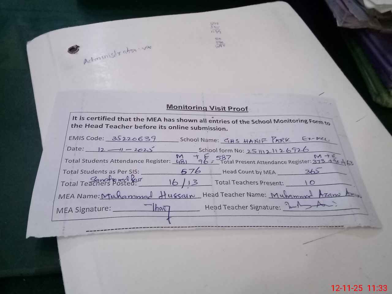 | Attendance Register | Head Teacher | MEA with School | Visit Proof |