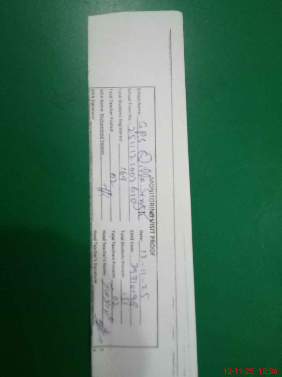 | Attendance Register | Head Teacher | MEA with School | Visit Proof |