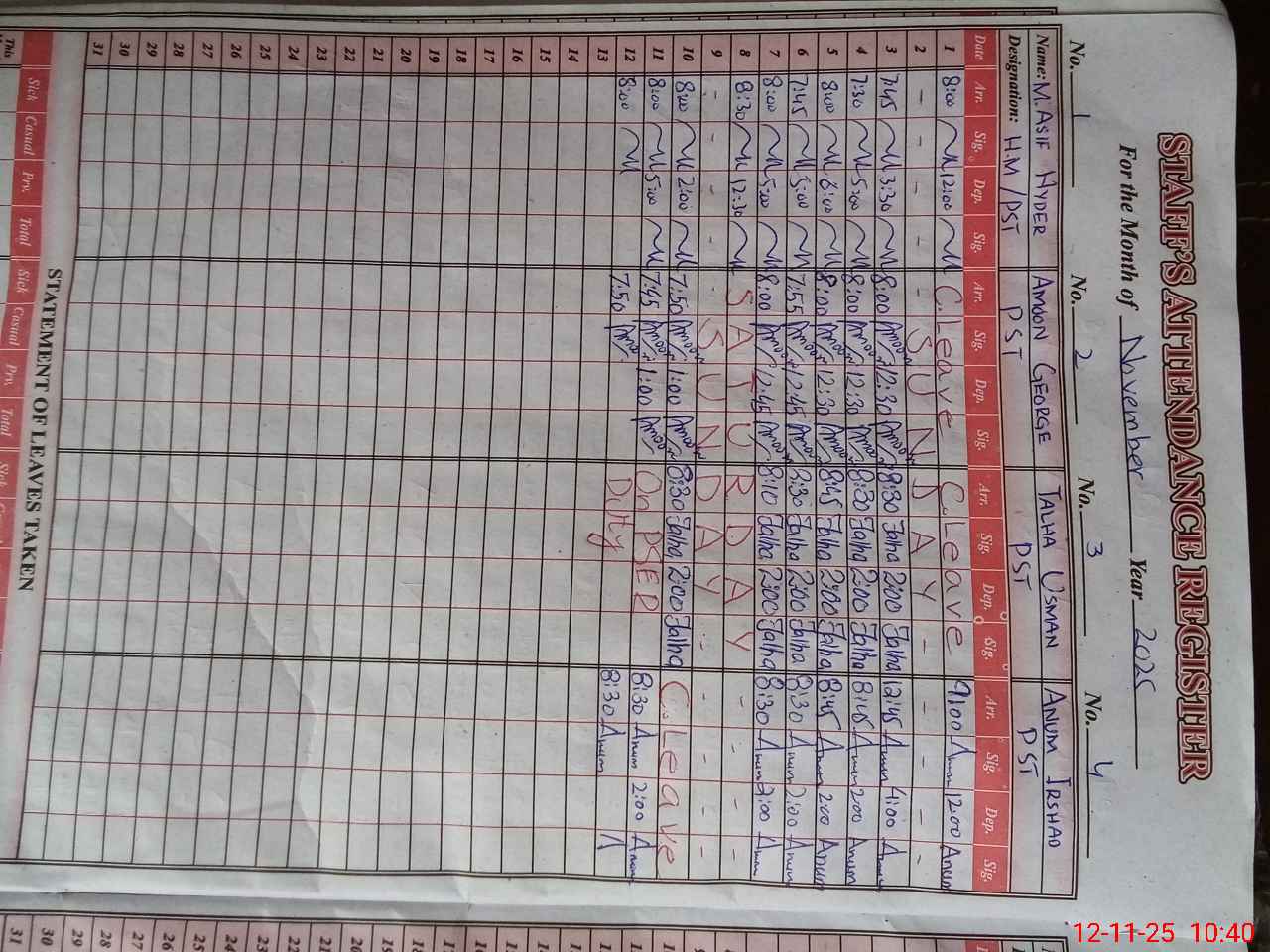 | CNIC | Full Name | Designation | R/C | Absence During Last Calender Month |