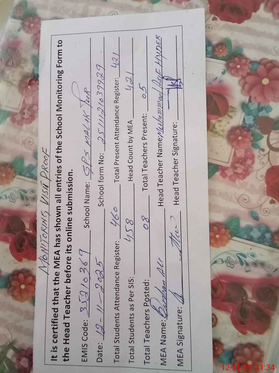 | Attendance Register | Head Teacher | MEA with School | Visit Proof |