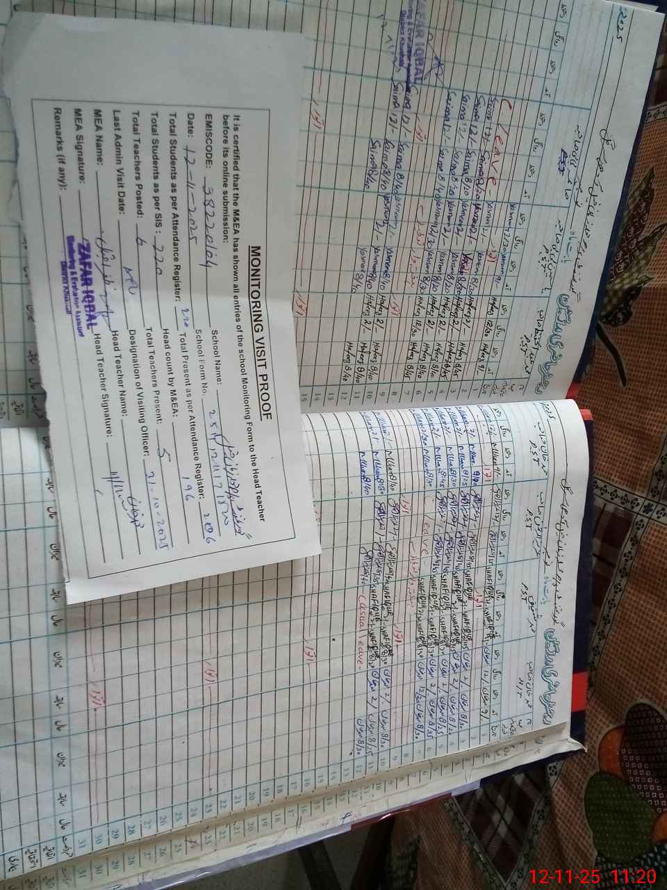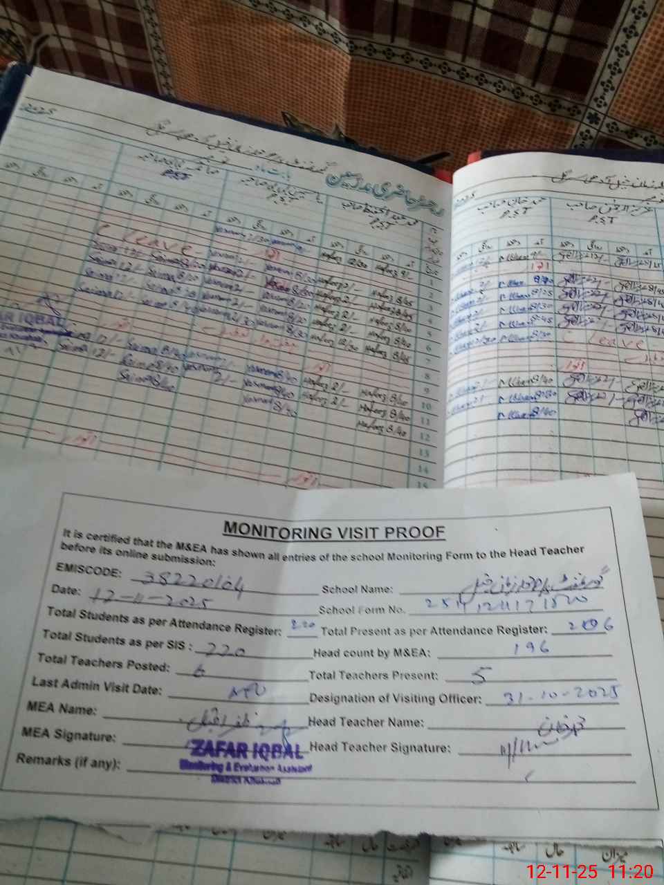 | Attendance Register | Head Teacher | MEA with School | Visit Proof |