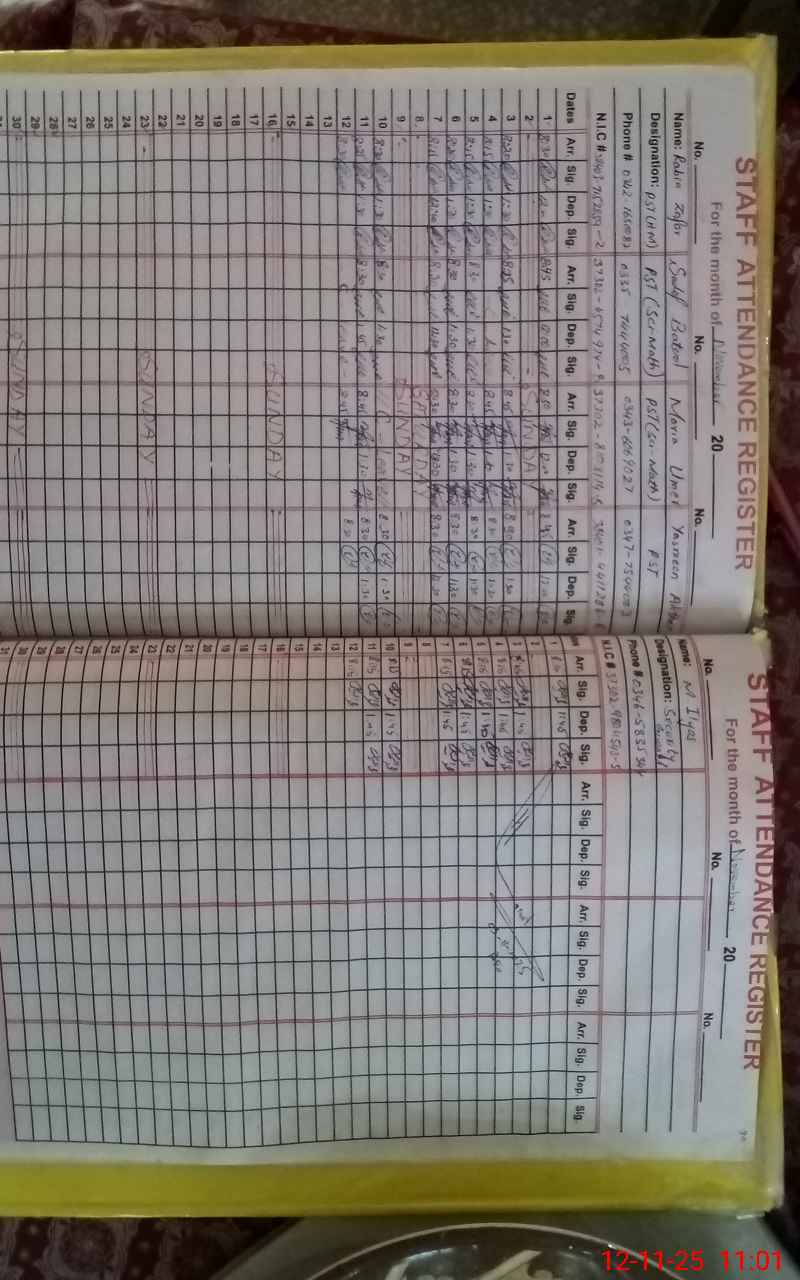 | CNIC | Full Name | Designation | R/C | Absence During Last Calender Month |
