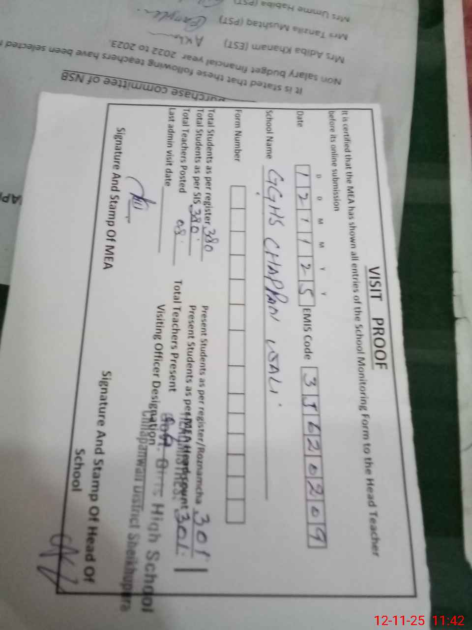 | Attendance Register | Head Teacher | MEA with School | Visit Proof |