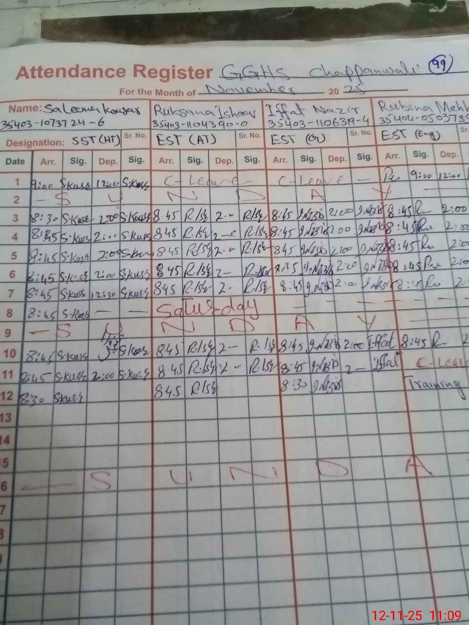 | CNIC | Full Name | Designation | R/C | Absence During Last Calender Month |