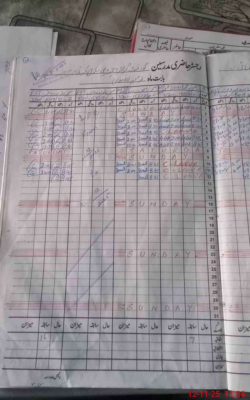 | CNIC | Full Name | Designation | R/C | Absence During Last Calender Month |