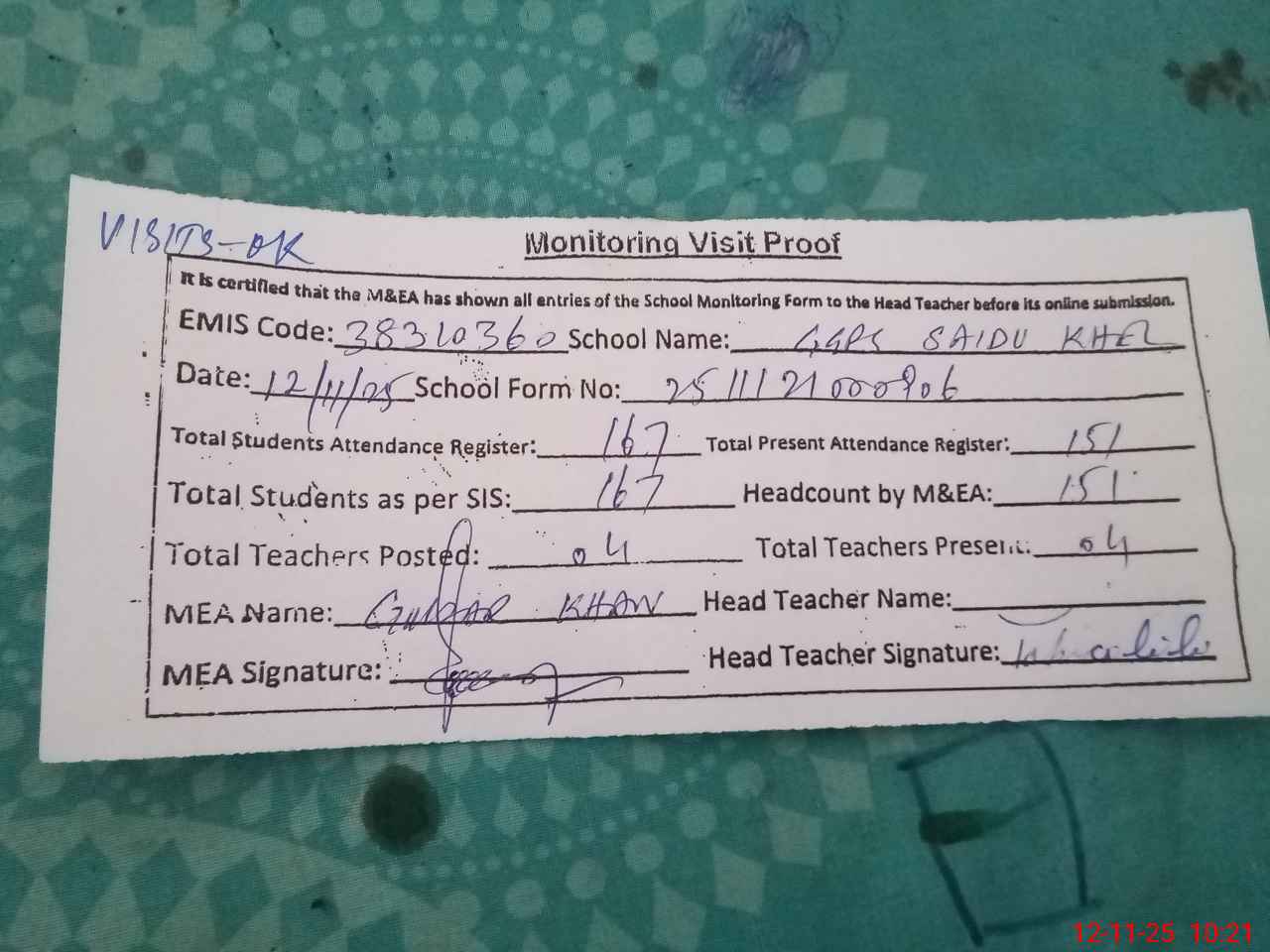 | Attendance Register | Head Teacher | MEA with School | Visit Proof |
