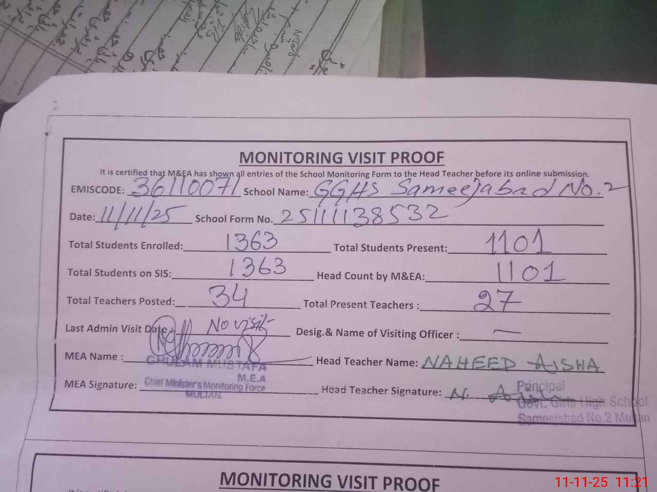 | Attendance Register | Head Teacher | MEA with School | Visit Proof |