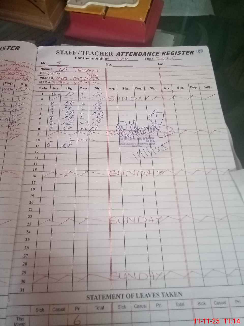 | CNIC | Full Name | Designation | R/C | Absence during last cal. month |