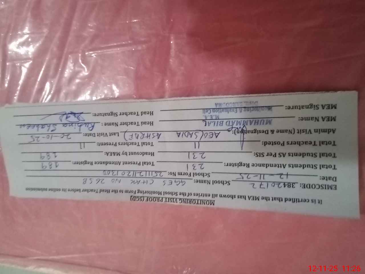 | Certified that this School was Inspected by the Undersigned MEA/DMO Today and the Information Stated Above is as Per Record. | |||||