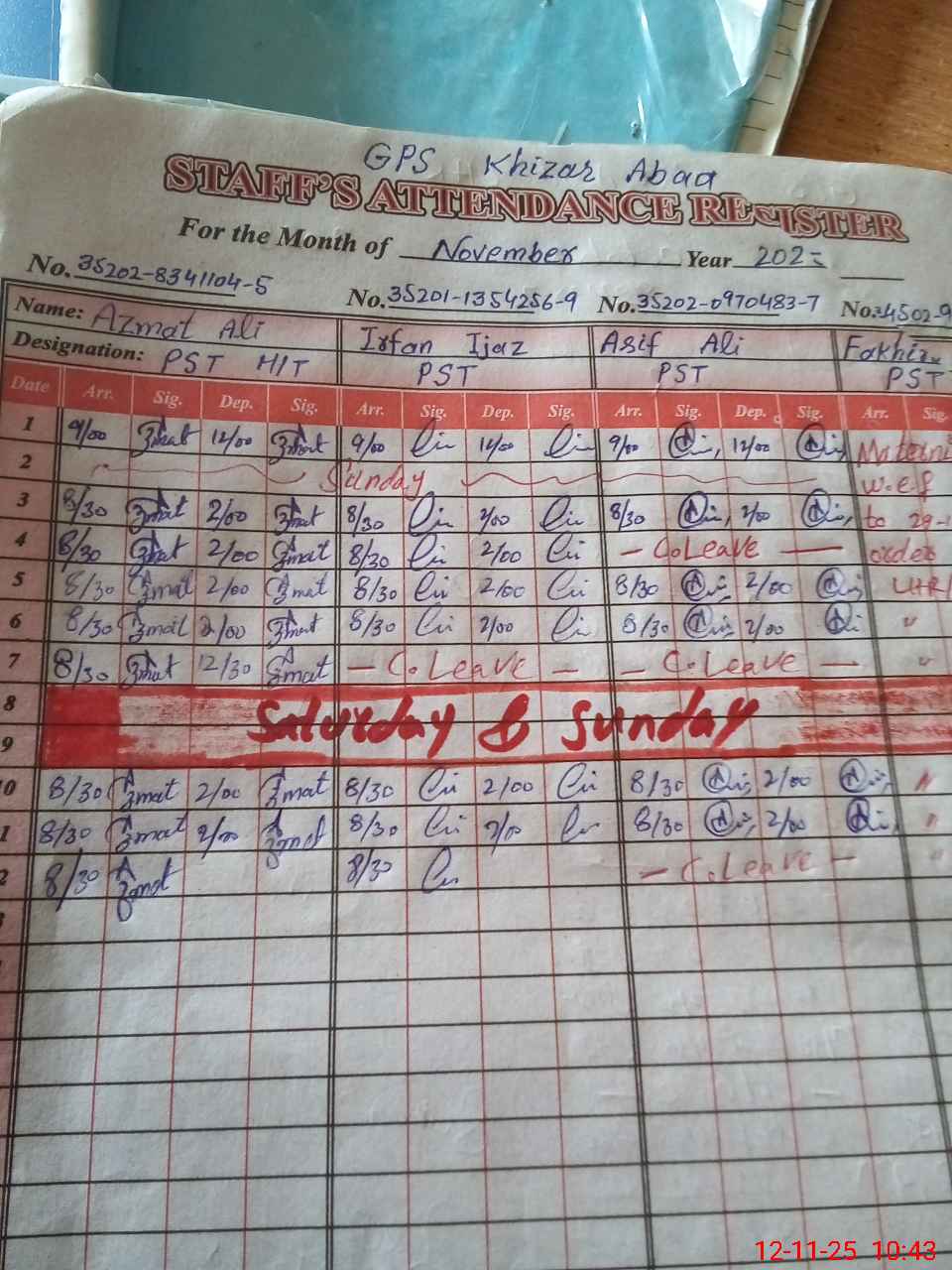 | CNIC | Full Name | Designation | R/C | Absence During Last Calender Month |