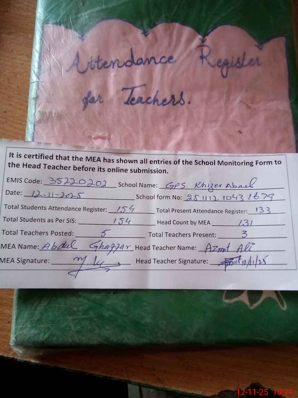 | Attendance Register | Head Teacher | MEA with School | Visit Proof |