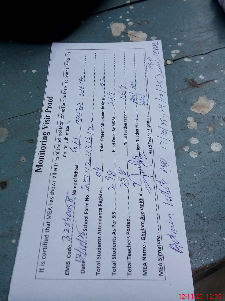 | Attendance Register | Head Teacher | MEA with School | Visit Proof |