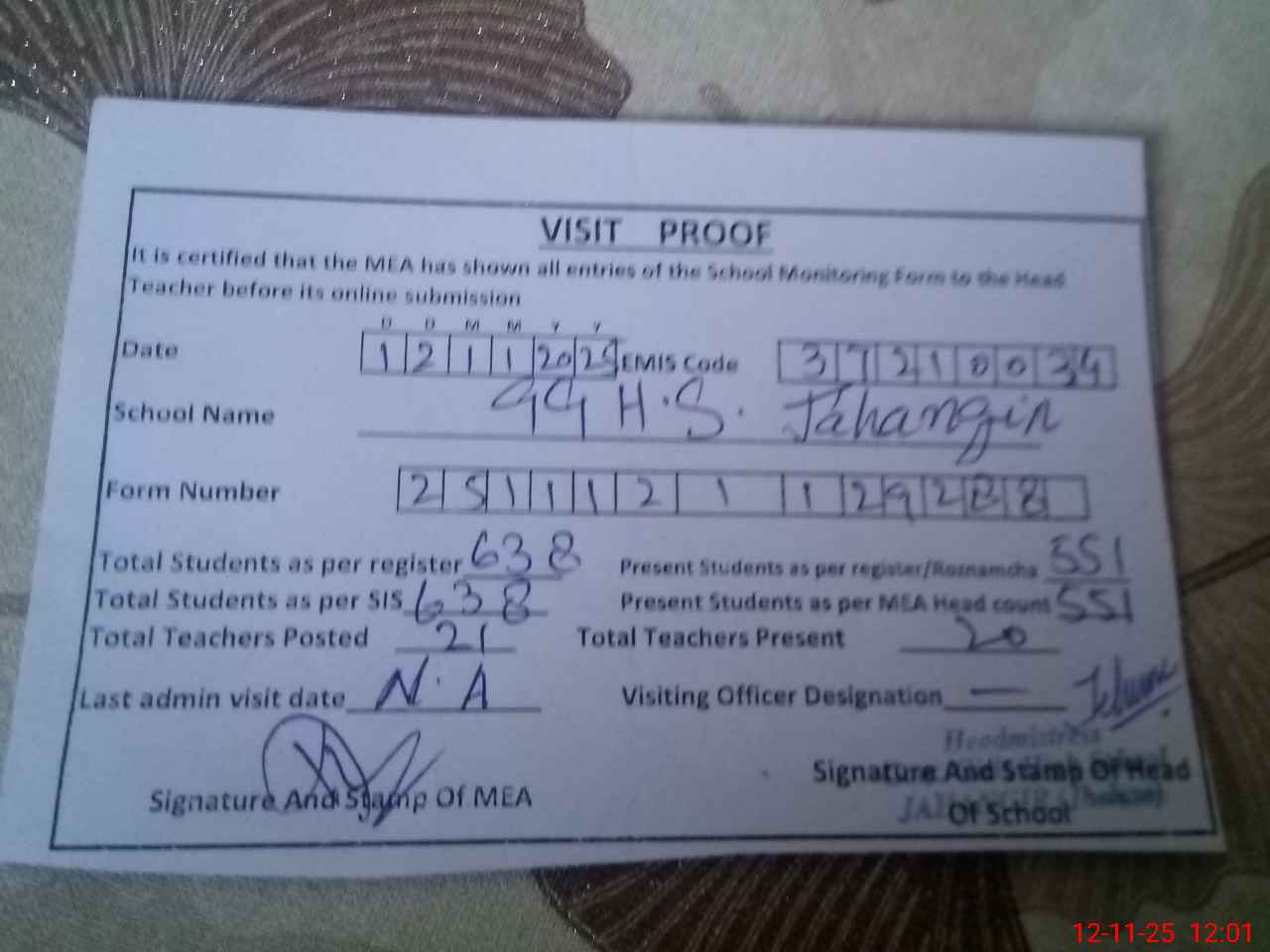 | Attendance Register | Head Teacher | MEA with School | Visit Proof |