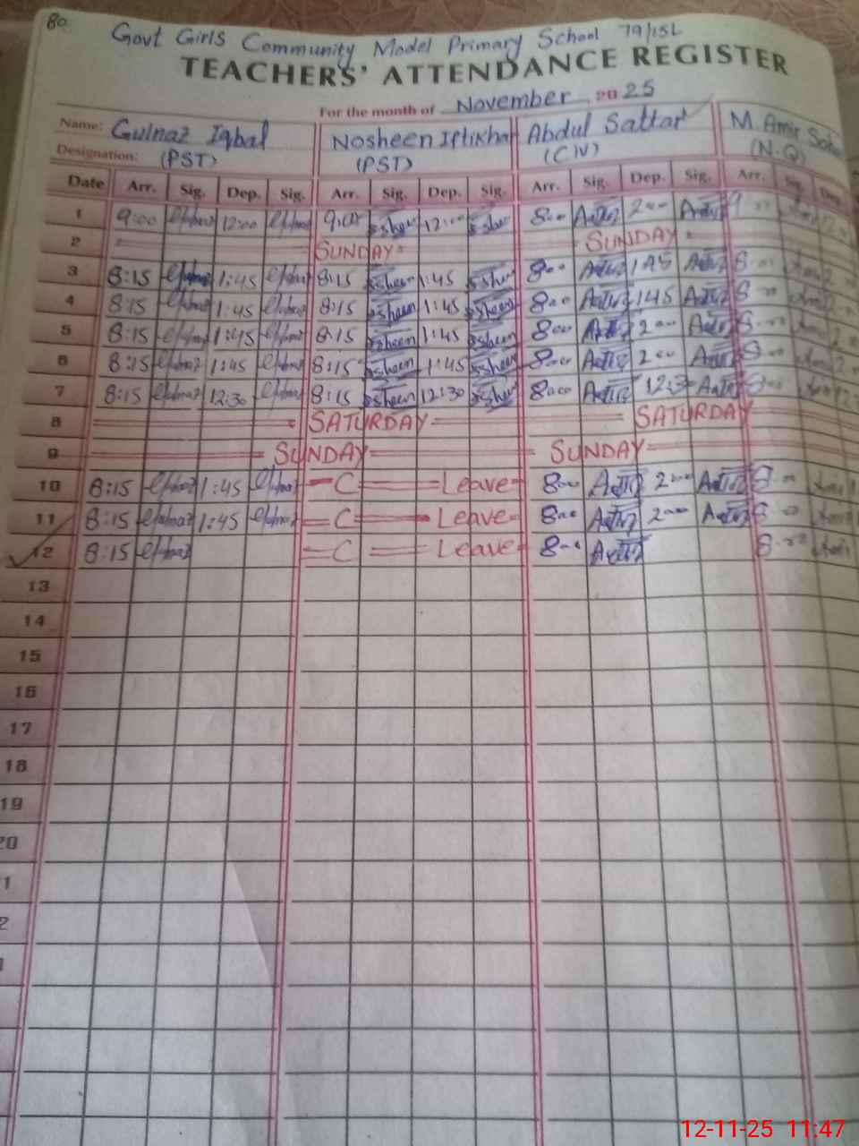 | CNIC | Full Name | Designation | R/C | Absence During Last Calender Month |
