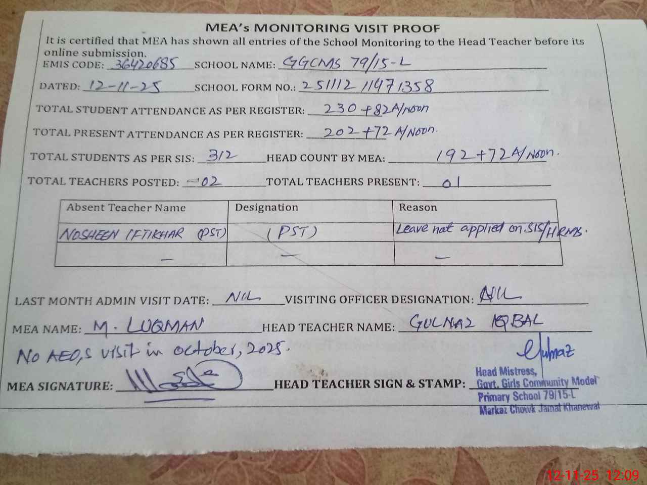 | Attendance Register | Head Teacher | MEA with School | Visit Proof |