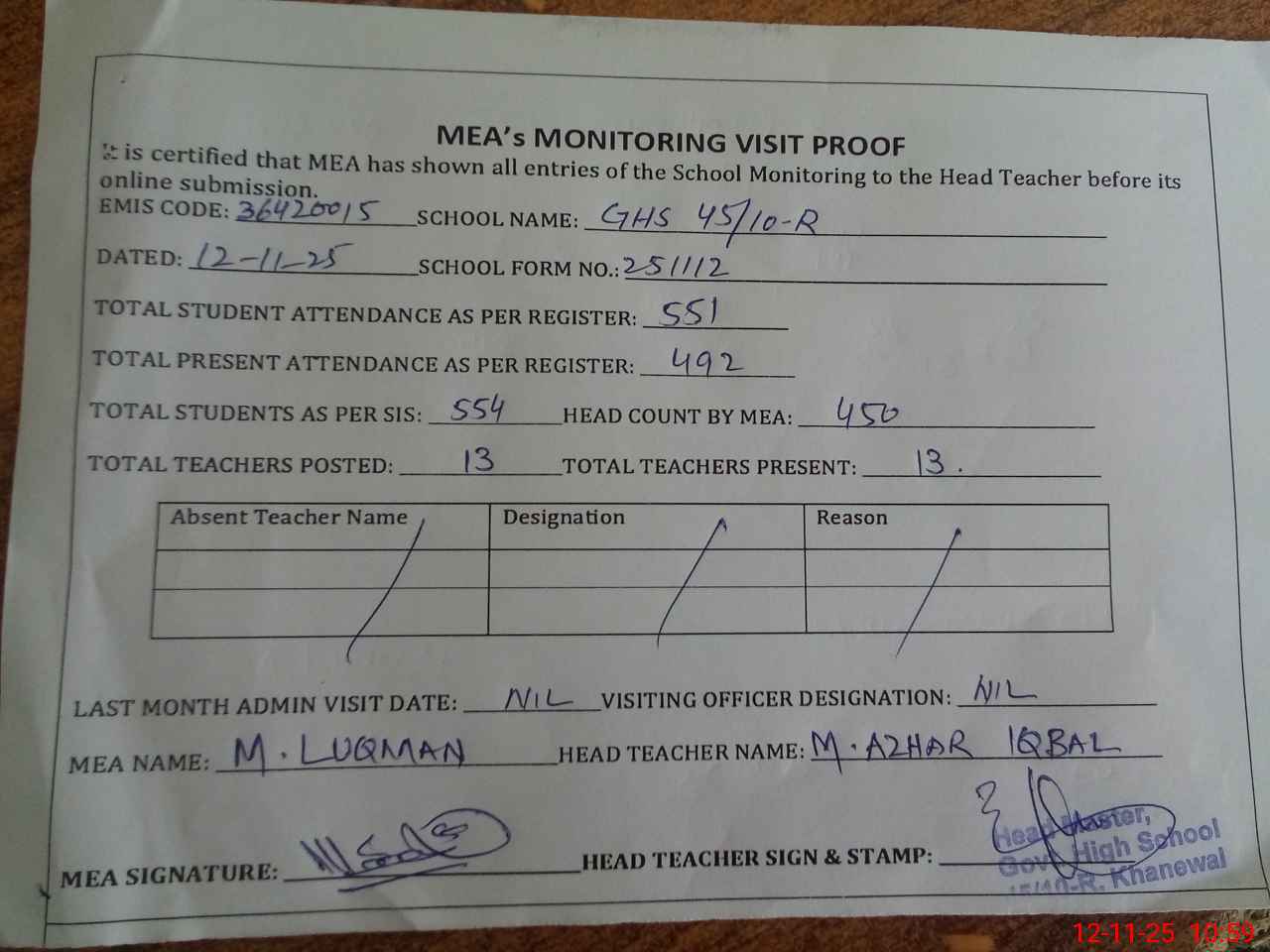 | Attendance Register | Head Teacher | MEA with School | Visit Proof |