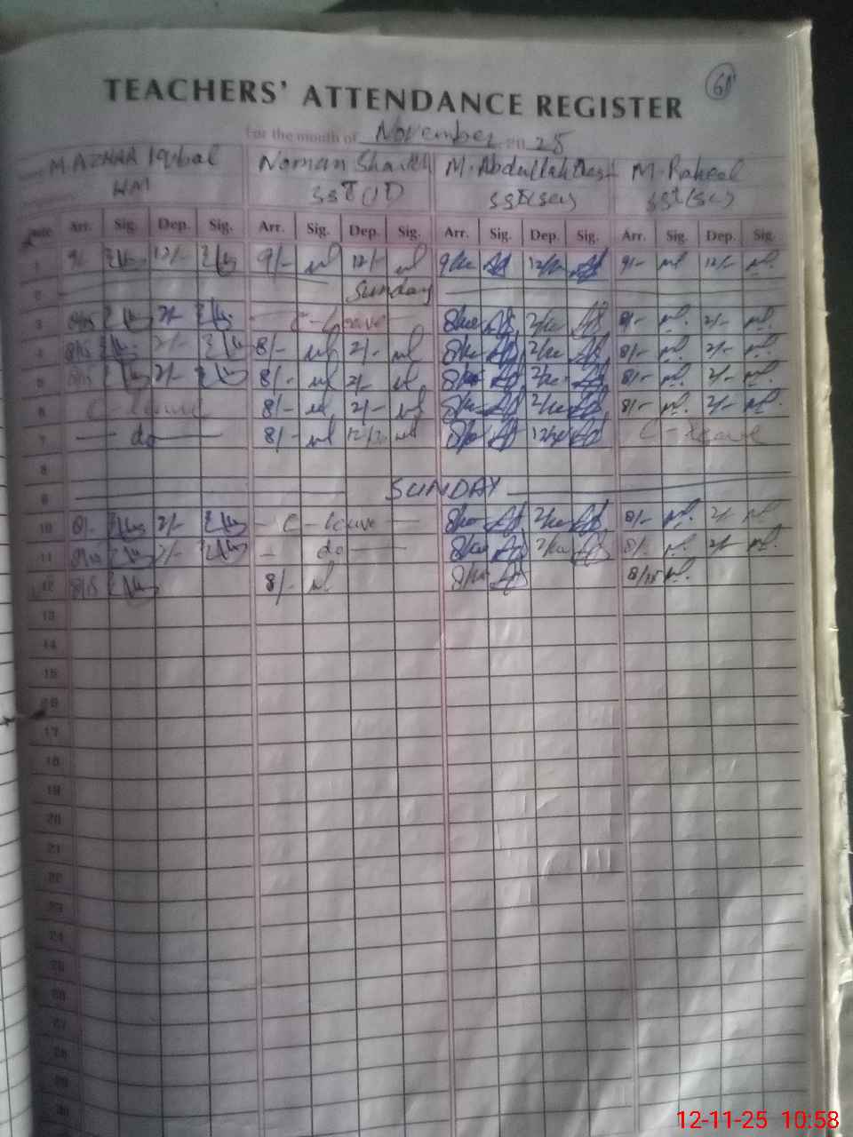 | CNIC | Full Name | Designation | R/C | Absence During Last Calender Month |