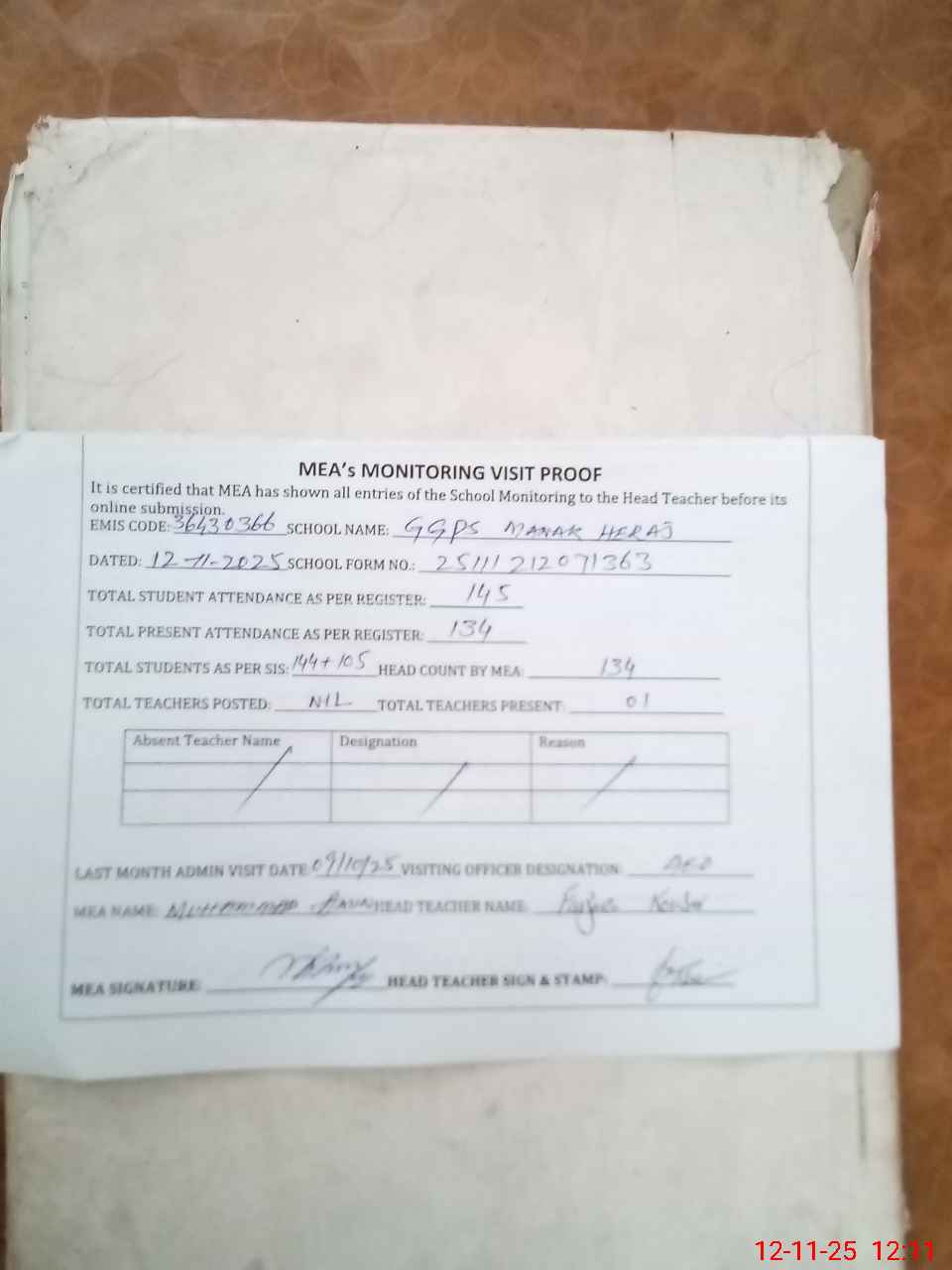 | Attendance Register | Head Teacher | MEA with School | Visit Proof |
