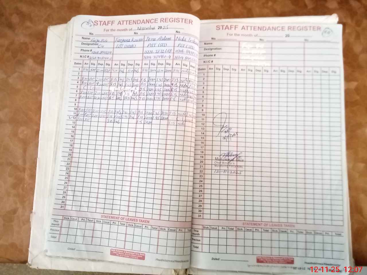| CNIC | Full Name | Designation | R/C | Absence During Last Calender Month |