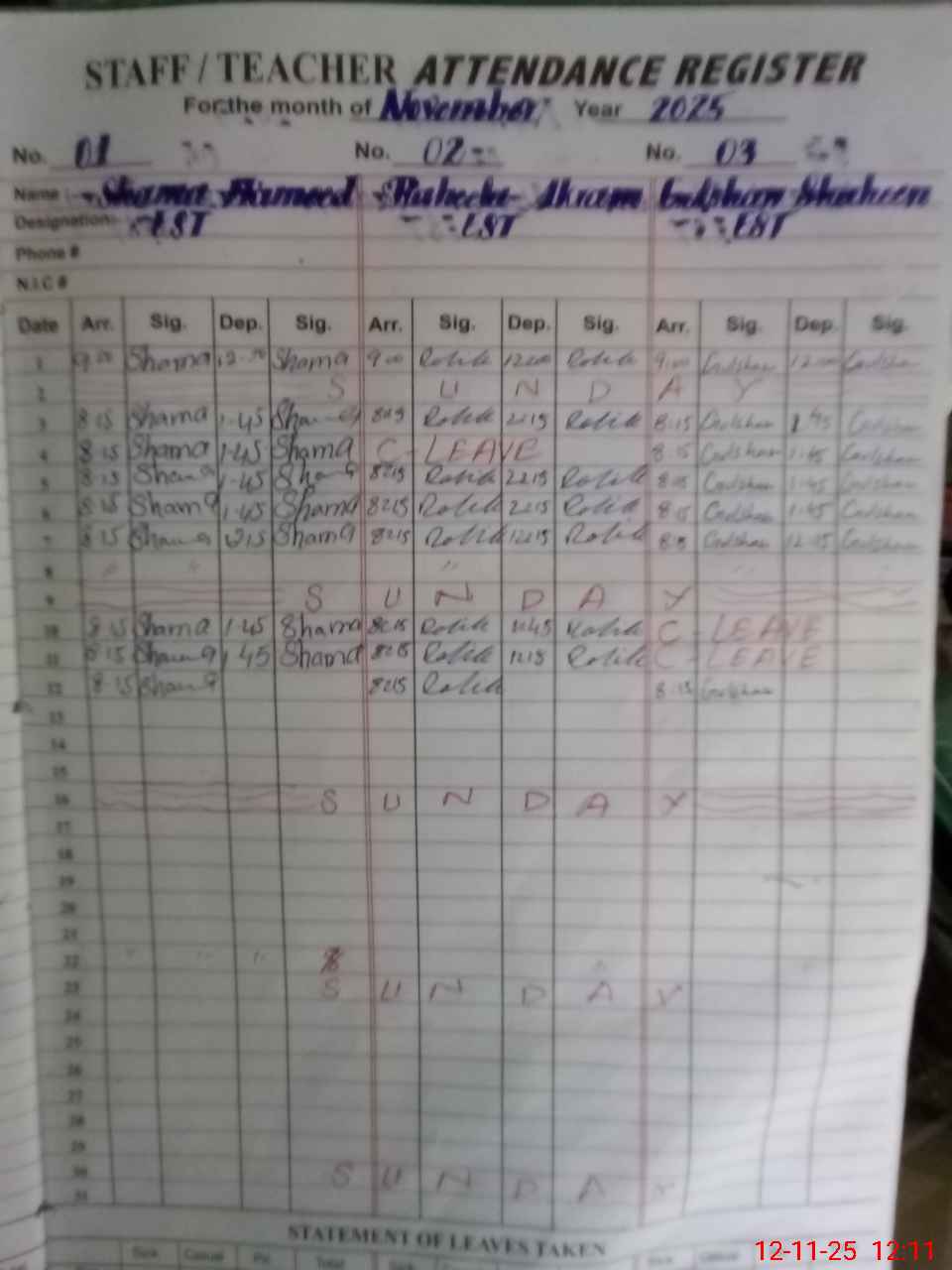 | CNIC | Full Name | Designation | R/C | Absence During Last Calender Month |