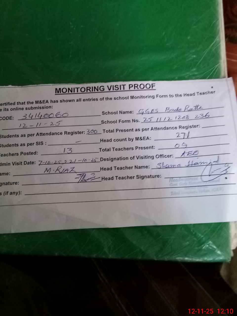 | Attendance Register | Head Teacher | MEA with School | Visit Proof |